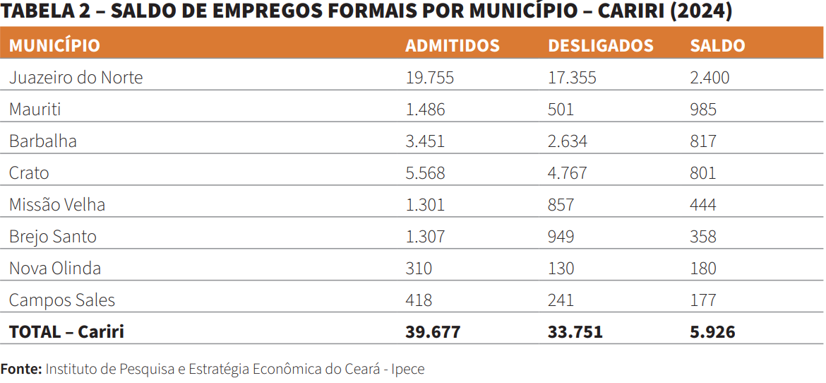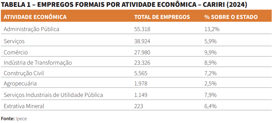 Esse volume representa uma participação significativa do Cariri no emprego formal do Ceará, refletindo a estrutura socioeconômica regional, onde centros de serviços de saúde, educação, logística e comércio atacadista exercem papel central. Além disso, indústrias calçadistas, têxteis, alimentícias e de materiais de construção mostram vitalidade, principalmente em Juazeiro do Norte, Crato, Barbalha, Brejo Santo e Missão Velha.