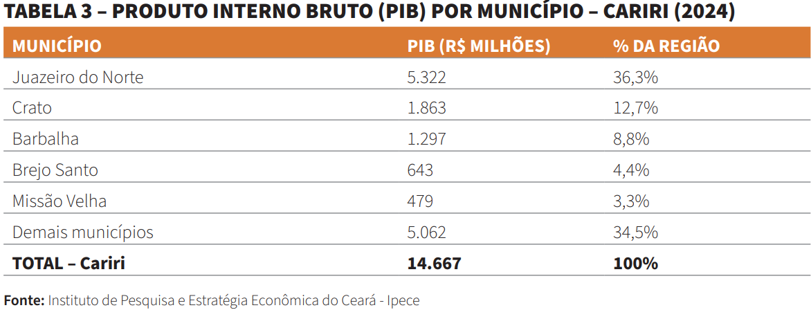 A economia do Cariri também tem peso na geração de riqueza estadual. O Produto Interno Bruto da região totalizou R$ 14,67 bilhões em 2024, o equivalente a 7,53% do PIB do Ceará. O destaque vai para Juazeiro do Norte, que concentra aproximadamente 36% do PIB regional, sendo seguido por Crato, Barbalha, Brejo Santo e Missão Velha.