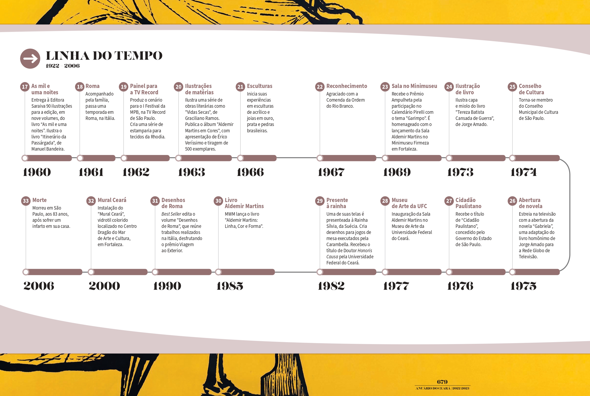 O centenário de um de nossos maiores artistas é o tema do capítulo especial e inspiração para o projeto gráfico do Anuário 2022-2023. Aldemir Martins deixou sua marca em uma carreira profícua de sete décadas e mais de sete mil obras. No acervo, galos e outras aves; cangaceiros; gatos e muitas flores e frutas. Sem cerimônia, ele levou seus traços para a abertura de telenovelas – Gabriela (1975) e Terras do Sem Fim (1981) -, embalagens de sabonetes, latas de tintas e de sorvetes. A quem o criticava, dizia que até a Capela Sistina de Michelangelo foi encomendada.