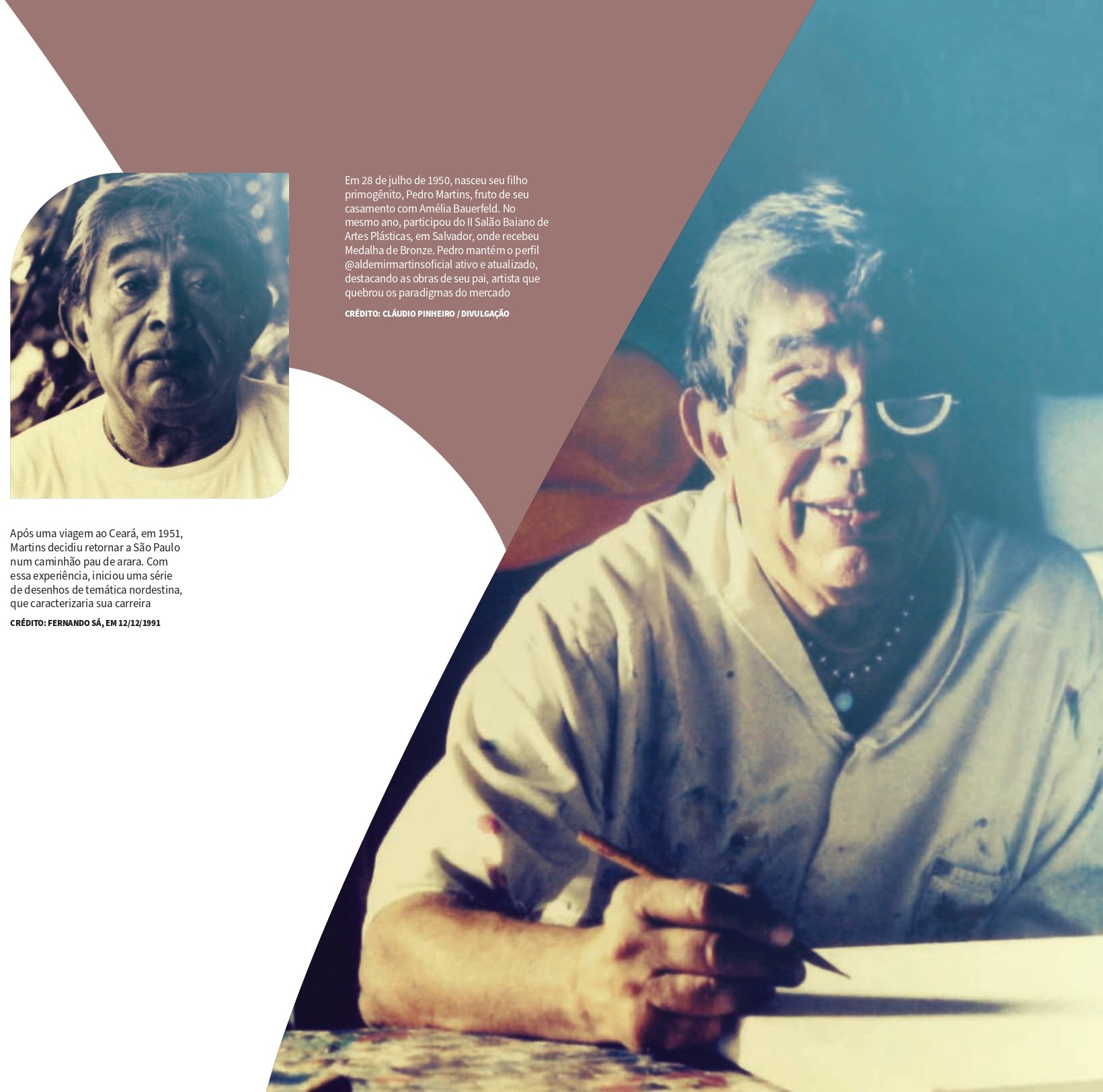 “Aldemir era uma criança inquieta que fazia desenhos para dar para um tio que tinha dinheiro — a cada desenho, recebia um dinheirinho, então enchia o tio de desenhos”, ri-se Pedro Martins, filho do artista. “Meu pai recebeu influência do Vale do Cariri, das rendeiras, dos desenhos rupestres de peixes e pássaros… Tudo isso ficou na retina de Aldemir logo no início da infância. Ele pintava com carvão, com tijolo na calçada”, rememora. Miguel, avô de Pedro, era encarregado da construção de estradas de ferro na Rede Viação Cearense, por isso a família se mudou várias vezes durante a infância do pintor e escultor. Quando Aldemir tinha 11 anos, os pais se estabeleceram no município de Pacatuba.