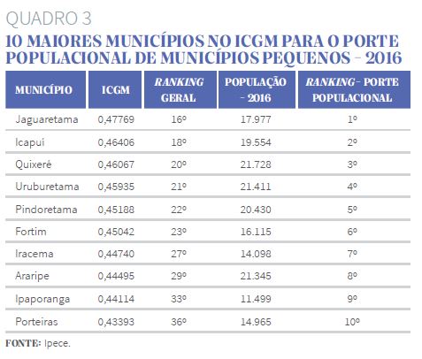 Neste recorte da análise, avalia-se o ranking dos municípios quanto ao ICGM conforme o porte populacional, identificando, por exemplo, se um determinado município foi qualificado em uma baixa colocação no ranking geral, mas no seu grupo populacional pode ter tido uma melhor classificação. Neste contexto, o Quadro 3 exibe o ranking dos 10 melhores municípios para o porte pequeno (com até 25 mil habitantes), verificando-se que a classificação geral dos mesmos variou entre o 16º e o 36º lugar. Os cinco primeiros, neste grupo, foram Jaguaretama, Icapuí, Quixeré, Uruburetama e Pindoretama.