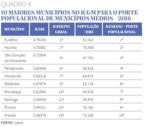 O Quadro 4 mostra o ranking dos 10 melhores municípios para o porte populacional médio (população acima de 25 mil e menor que 100 mil habitantes), observando-se que a classificação geral dos mesmos variou entre a 1ª e 13ª posição, significando que os municípios de porte médio alcançaram melhores índices do ICGM que os demais grupos. Os cinco primeiros, neste grupo, foram Eusébio, Aquiraz, São Gonçalo do Amarante, Pentecoste e Horizonte.