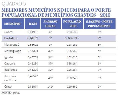 O Quadro 5 apresenta o ranking dos municípios para o porte populacional grande (população acima 100 mil habitantes), verificando-se que o município de Sobral obteve, em 2016, a melhor colocação neste grupo. Em seguida, tem-se os municípios de Fortaleza, Maracanaú, Maranguape e Iguatu.