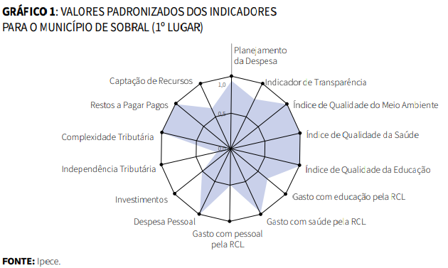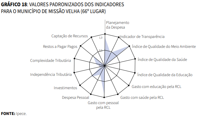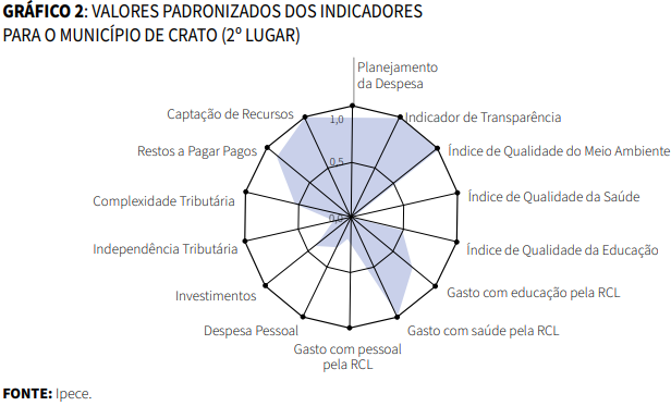 O Gráfico 2 mostra que o município do Crato (2º lugar) registrou nota máxima nos indicadores Captação de Recursos, Gasto com Saúde pela Receita Corrente Líquida, Índice de Qualidade do Meio Ambiente e Indicador de Transparência. No entanto, o município obteve valores abaixo de 0,5 em nove indicadores: Investimentos, Despesa de Pessoal, Gasto com Pessoal pela Receita Corrente Líquida, Independência Tributária e Índice de Qualidade da Saúde o que impactou negativamente no seu ranking, nos municípios do Grupo Populacional 1.