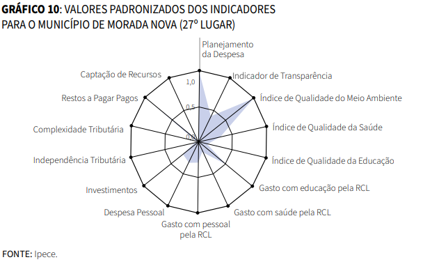 Os Gráficos 10 a 12 apresentam os valores padronizados dos indicadores dos três municípios que obtiveram os menores resultados no ICGM 2020, dentre aqueles do Grupo Populacional 2. Por exemplo, Morada Nova (Gráfico 10) obteve a última posição e somente o indicador Índice de Qualidade do Meio Ambiente alcançou valor máximo. Os indicadores Planejamento da Despesa, Restos a Pagar Pagos e Gasto com educação pela Receita Corrente Líquida ficaram com valores acima de 0,5. No total, 10 indicadores contribuíram para uma não qualidade na gestão municipal com valores abaixo de 0,5.