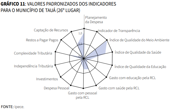 Tauá (Gráfico 11) apesar de estar na penúltima colocação no ranking dos municípios do Grupo Populacional 2, registrou um indicador com valor máximo, o Índice de Qualidade do Meio Ambiente. Também obteve bons resultados em quatro indicadores, com valores acima de 0,5: Planejamento da Despesa, Índice de Qualidade da Saúde, Complexidade Tributária e Captação de Recursos. Nove indicadores ficaram com valores abaixo de 0,5, ficando na 26ª posição no ranking do ICGM 2020.