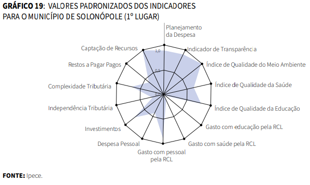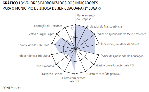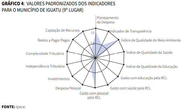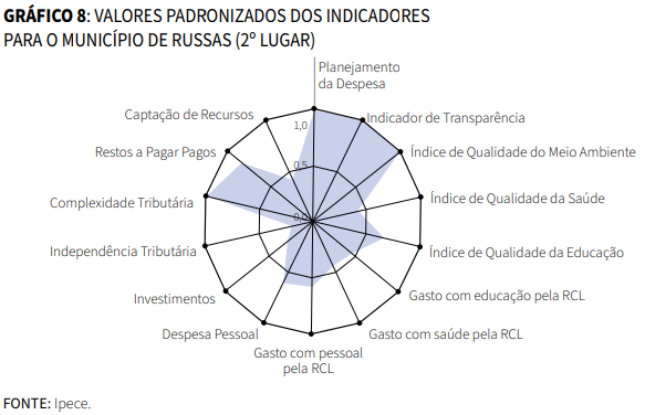 Russas (Gráfico 8) ficou no 2º lugar no grupo dos municípios do Grupo Populacional 2. Três indicadores obtiveram valor igual a 1,0: Planejamento da Despesa, Índice de Qualidade do Meio Ambiente e Indicador de Transparência; outros cinco indicadores alcançaram resultados acima de 0,5: Complexidade Tributária, Restos a Pagar Pagos, Índice de Qualidade da Educação, Despesa de Pessoal e Gasto com pessoal pela Receita Corrente Líquida. Seis indicadores obtiveram resultado abaixo de 0,5.