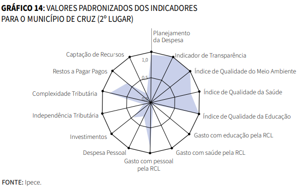 Cruz (Gráfico 14) ficou no 2º lugar no grupo dos municípios do Grupo Populacional 3 em 2020 e alcançou valor máximo em três indicadores: Índice de Qualidade da Educação, Índice de Qualidade do Meio Ambiente e Indicador de Transparência. Também obteve bons resultados acima de 0,5 em cinco indicadores: Planejamento da Despesa, Gasto com Pessoal pela Receita Corrente Líquida, Complexidade Tributária, Índice de Qualidade da Saúde e Restos a Pagar Pagos. Seis indicadores obtiveram resultado abaixo de 0,5.