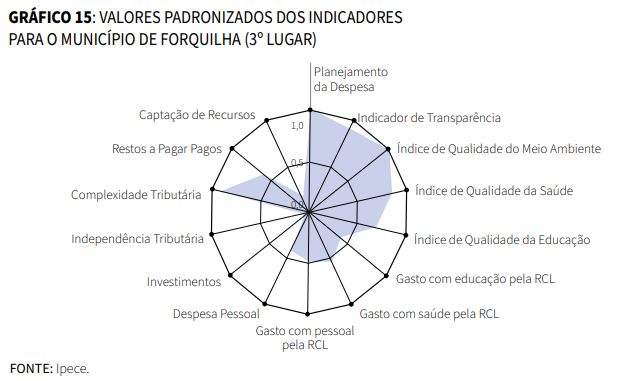 Em 2020, Forquilha (Gráfico 15) se destacou nos indicadores Planejamento da Despesa e Índice de Qualidade do Meio Ambiente, onde obteve valor igual a 1,0. Outros seis indicadores contribuíram para o município alcançar a terceira posição no ranking do ICGM 2020 no grupo dos municípios do Grupo Populacional 3, pois obtiveram resultados acima de 0,5: Complexidade Tributária, Indicador de Transparência, Índice de Qualidade da Saúde, Índice de Qualidade da Educação, Restos a Pagar Pagos e Gasto com Saúde pela Receita Corrente Líquida. Seis indicadores obtiveram resultado abaixo de 0,5.