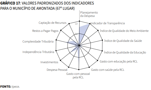 Amontada (Gráfico 17) ocupa a 67ª colocação no ranking dos municípios do Grupo Populacional 3, onde o Indicador de Transparência alcançou valor máximo e outros três obtiveram valores acima de 0,5: Gasto com Pessoal pela Receita Corrente Líquida, Planejamento da Despesa e Complexidade Tributária. Os outros dez tiveram resultado abaixo de 0,5.