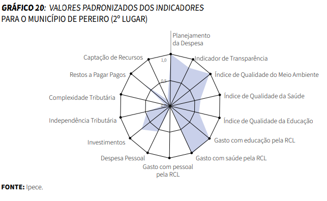 O município de Pereiro (Gráfico 20) ficou no 2º lugar no grupo dos municípios do Grupo Populacional 4 em 2020 e obteve valor máximo em três indicadores: Gasto com Saúde pela Receita Corrente Líquida, Gasto com Educação pela Receita Corrente Líquida e Índice de Qualidade do Meio Ambiente. Sete indicadores alcançaram resultado acima de 0,5: Planejamento da Despesa, Indicador de Transparência, Investimentos, Restos a Pagar Pagos, Índice de Qualidade da Saúde, Índice de Qualidade da Educação e Despesa de Pessoal. Apenas quatro indicadores tiveram resultado abaixo de 0,5.