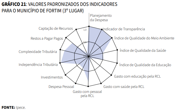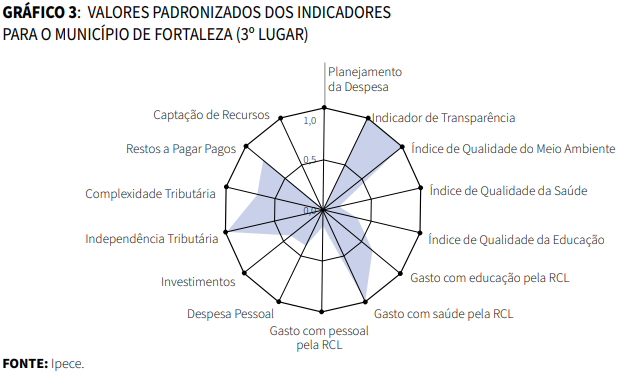 Em 2020, Fortaleza (Gráfico 3) obteve nota máxima em três indicadores: Independência Tributária, Índice de Qualidade do Meio Ambiente e Indicador de Transparência. Em quatro indicadores o município obteve resultados que lhe permitiu a terceira posição no ranking do ICGM 2020 dentre os municípios do Grupo Populacional 1. No entanto, o município obteve valores abaixo de 0,5 em sete indicadores: Investimentos, Despesa de Pessoal, Índice de Qualidade da Educação, Gasto com Pessoal pela Receita Corrente Líquida, Índice de Qualidade da Saúde, Planejamento da Despesa e Captação de Recursos.
