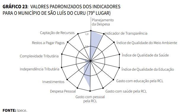 Na sequência, o município de São Luís do Curu (Gráfico 23), ocupando a 79ª posição no ranking dos municípios do Grupo Populacional 4, que também não teve qualquer indicador com valor 1,0 e anotou bons resultados em apenas três indicadores, com valores acima de 0,5: Planejamento da Despesa, Indicador de Transparência e Gasto com Pessoal pela Receita Corrente Líquida. 11 indicadores tiveram resultado abaixo de 0,5.
