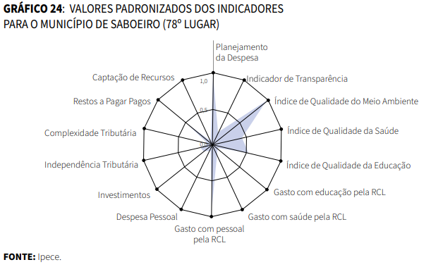 Por fim, Saboeiro (Gráfico 24) ficando na 78ª posição no ranking do ICGM 2020 dentre os municípios do Grupo Populacional 4, conseguiu apresentar valor máximo no indicador Índice de Qualidade do Meio Ambiente, e em Planejamento da Despesa, Gasto com Pessoal pela Receita Corrente Líquida e Índice de Qualidade da Educação obteve resultados acima de 0,5. 10 indicadores tiveram resultado abaixo de 0,5.