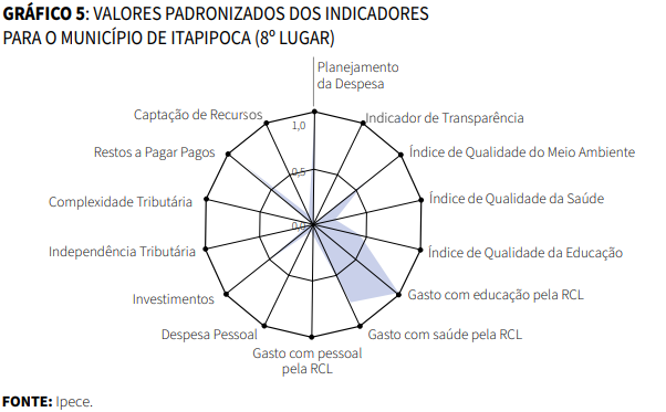 Itapipoca (Gráfico 5) não alcançou resultado máximo em qualquer indicador, mas obteve bons resultados nos indicadores: Planejamento da Despesa, Gasto com Educação pela Receita Corrente Líquida, Restos a Pagar Pagos, Gasto com Saúde pela Receita Corrente Líquida, Índice de Qualidade do Meio Ambiente e Investimento. Em 2020, o município teve resultado abaixo de 0,5 em oito indicadores, posicionando-o em oitavo lugar entre os municípios do Grupo Populacional 1.