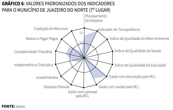 Em 2020, Juazeiro do Norte (Gráfico 6) se destacou com resultado máximo nos indicadores: Gasto com Educação pela Receita Corrente Líquida e Indicador de Transparência. Obteve resultados médios em quatro indicadores (Planejamento da Despesa, Gasto com Saúde pela Receita Corrente Líquida, Complexidade Tributária, Restos a Pagar Pagos) e em outros oito indicadores tirou resultado abaixo de 0,5.