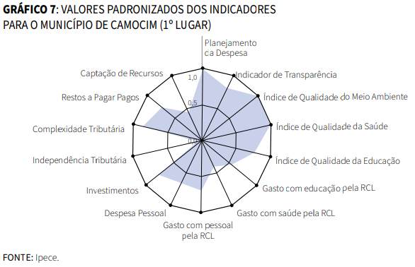 Os Gráficos 7 a 9 apresentam os valores padronizados dos indicadores dos três municípios que lideram o ICGM 2020, dentre aqueles do Grupo Populacional 2. O município de Camocim obteve o 1º lugar no grupo dos municípios do Grupo Populacional 2 (Gráfico 7), os dois indicadores que obtiveram valor igual a 1,0 foram Índice de Qualidade da Saúde e Índice de Qualidade do Meio Ambiente. Outros nove indicadores alcançaram resultado acima de 0,5: Planejamento da Despesa, Complexidade Tributária, Indicador de Transparência, Investimentos, Índice de Qualidade da Educação, Restos a Pagar Pagos, Gasto com pessoal pela Receita Corrente Líquida, Despesa de Pessoal e Gasto com educação pela Receita Corrente Líquida. Três indicadores obtiveram resultado abaixo de 0,5.