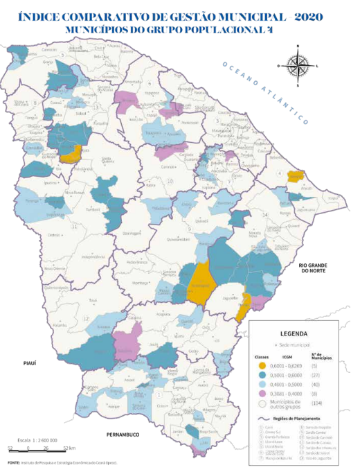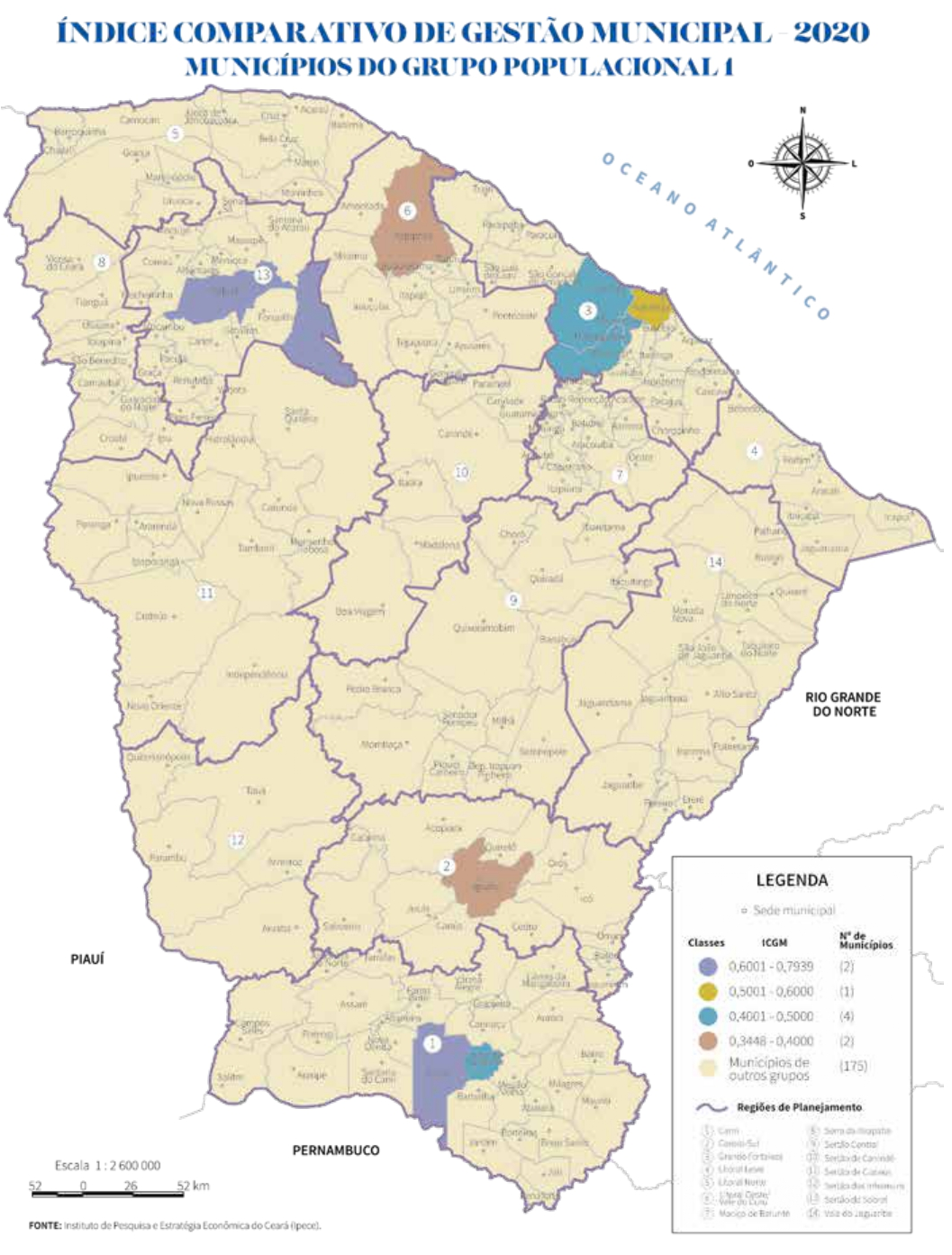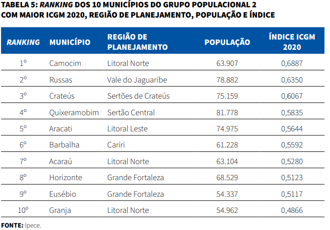 Na sequência, verifica-se na Tabela 5 que Camocim apresentou o maior ICGM 2020 (0,6887) dentro do grupo dos municípios do Grupo Populacional 2, seguido por Russas (0,6350) e Crateús (0,6067). Dentre os 10 municípios do Grupo Populacional 2 de maior ICGM 2020, três estão localizados na Região de Planejamento do Litoral Norte, dois na Grande Fortaleza, e apenas um município nas regiões do Cariri, Litoral Leste, Sertão Central, Sertão de Crateús e Vale do Jaguaribe, mostrando uma certa dispersão espacial dos melhores colocados.