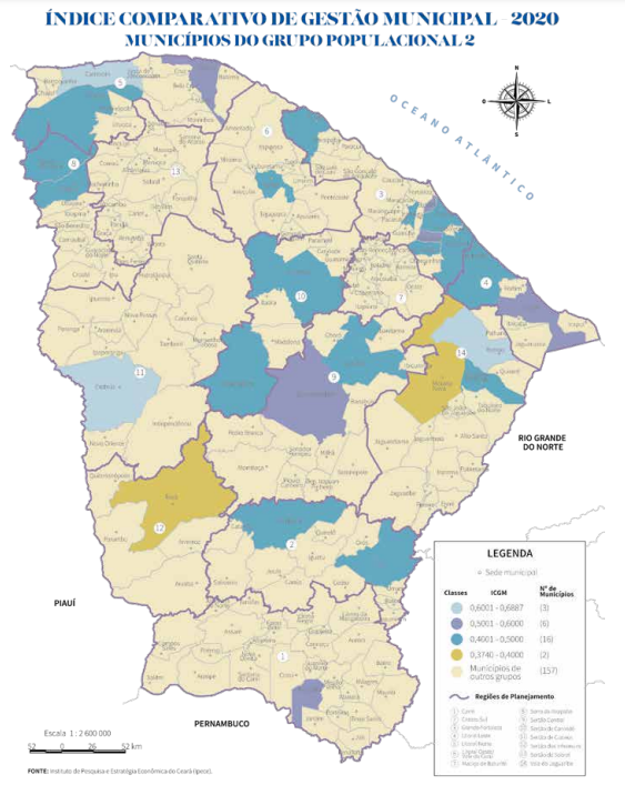 Em relação aos 27 municípios considerados do Grupo Populacional 2, Camocim apresentou o maior ICGM 2020 (0,6887), seguido por Russas (0,6350) e Crateús (0,6067). Em contrapartida, o menor índice foi apresentado por Morada Nova (0,3740), seguido por Tauá (0,3757) e Canindé (0,4130).