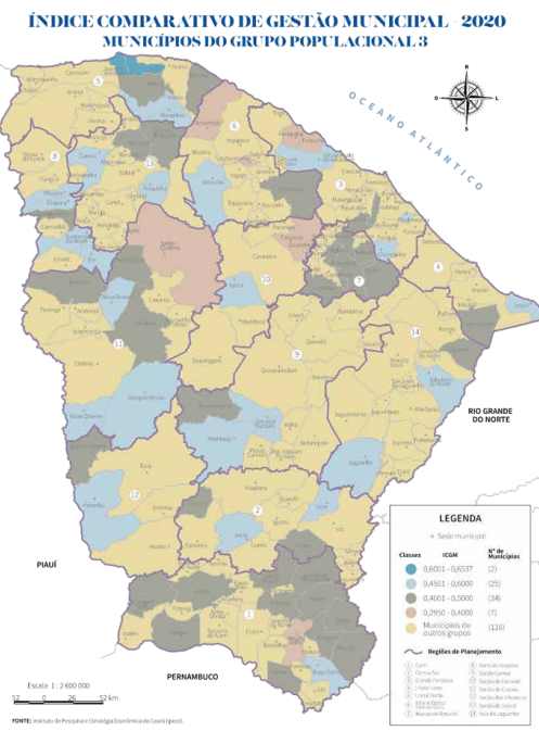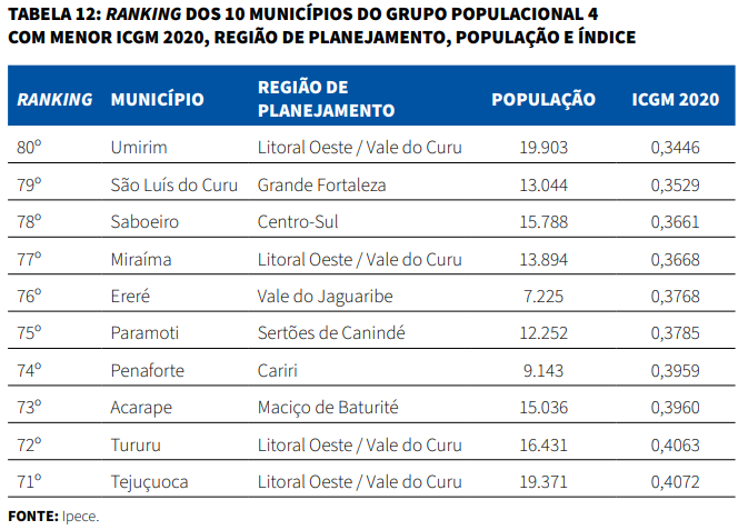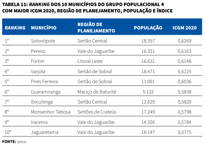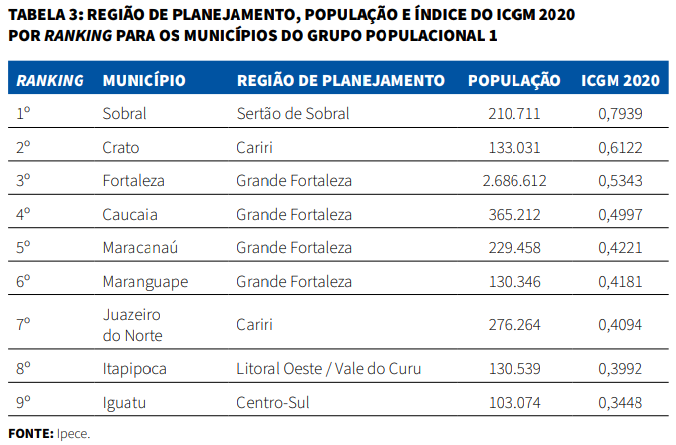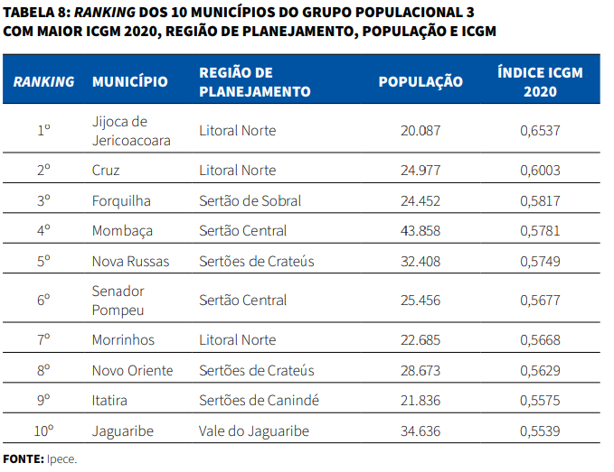 Na Tabela 8 verifica-se que Jijoca de Jericoacoara apresentou o maior ICGM 2020 (0,6537) dentro do grupo dos municípios do Grupo Populacional 3, seguido por Cruz (0,6003) e Forquilha (0,5817). Dentre os dez municípios de maior ICGM 2020, três estão localizados na Região de Planejamento Litoral Norte, dois nas regiões do Sertão Central e Sertões de Crateús, e apenas um município nas regiões do Sertão de Sobral, Sertões de Canindé e Vale do Jaguaribe.