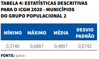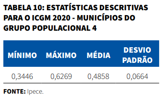 O maior ICGM 2020 deste grupo foi igual a 0,6887 (Camocim) e o menor foi de 0,3740 (Morada Nova). A média dos índices correspondeu a 0,4897 e o desvio-padrão encontrado foi de 0,0742, indicando baixa variabilidade do ICGM 2020 dentro deste grupo de municípios com este porte populacional (Tabela 4).