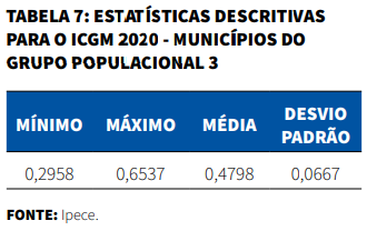 Com relação ao Grupo Populacional 3 que abrange 68 municípios, o maior ICGM 2020 foi evidenciado por Jijoca de Jericoacoara (0,6537), seguido por Cruz (0,6003) e Forquilha (0,5817). Considerando os municípios com menores ICGM 2020, neste grupo, tem-se Uruburetama (0,2958), posteriormente Amontada (0,3474) e Missão Velha (0,3688).