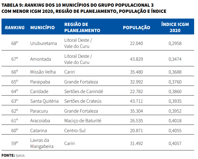 Analisando os dados da Tabela 9 percebe-se que Uruburetama apresentou o menor ICGM 2020 (0,2958) dentre os municípios considerados do Grupo Populacional 3, seguido por Amontada (0,3474) e Missão Velha (0,3688). Dentre os 10 municípios de menor ICGM 2020 do Grupo Populacional 3, dois estão localizados nas Regiões de Planejamento do Cariri, Grande Fortaleza, Litoral Oeste / Vale do Curu e Sertões de Canindé. Os outros dois estão nas Regiões de Planejamento do Centro-Sul e Maciço de Baturité.