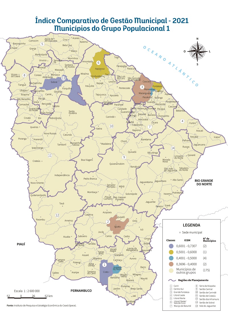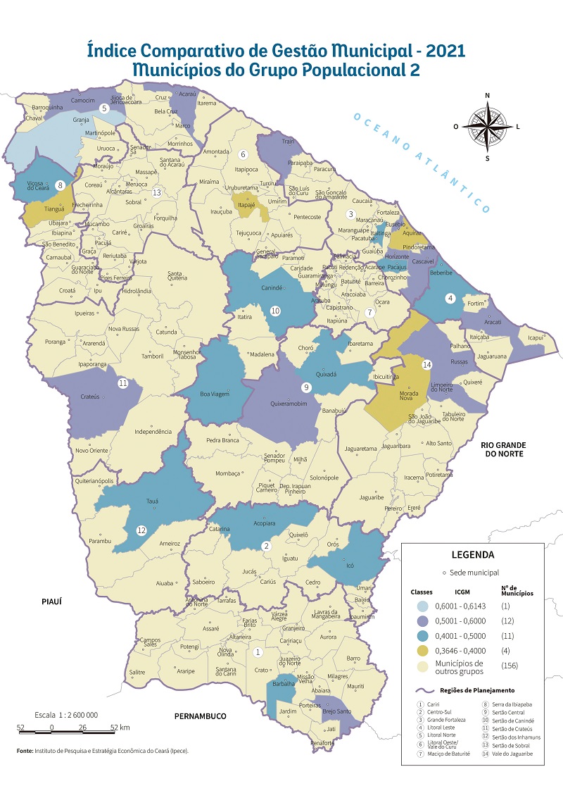 Dentre os dez municípios do Grupo Populacional 2 de maior ICGM 2021, três estão localizados na Região de Planejamento do Litoral Norte, dois na Grande Fortaleza e apenas um município nas regiões do Cariri, Litoral Leste, Sertão Central, Sertão de Crateús e Vale do Jaguaribe, mostrando uma certa dispersão espacial dos melhores colocados.