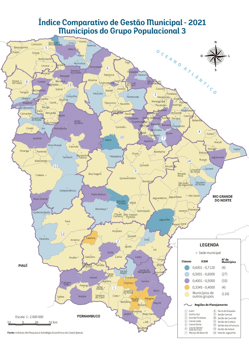 Dentre os dez municípios de menor ICGM 2021 do Grupo Populacional 3, três estão localizados nas Regiões de Planejamento do Cariri; três em Sertão de Sobral. Os outros quatro estão nas Regiões de Planejamento do Maciço de Baturité; Litoral Norte; Grande Fortaleza; e Centro Sul.