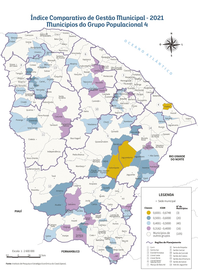 Avaliando os dados, observa-se que o município de Solonópole alcançou a melhor nota (0,6742), seguido dos municípios de Jaguaretama (0,6615) e Fortim (0,6333). Dentre os dez municípios do Grupo Populacional 4 com maior ICGM 2021, dois estão localizados na Região de Planejamento do Vale do Jaguaribe, dois na região Sertão Central, dois na região do Cariri e apenas um município nas regiões Sertões de Inhamuns, Maciço de Baturité, Litoral Leste e Centro Sul.