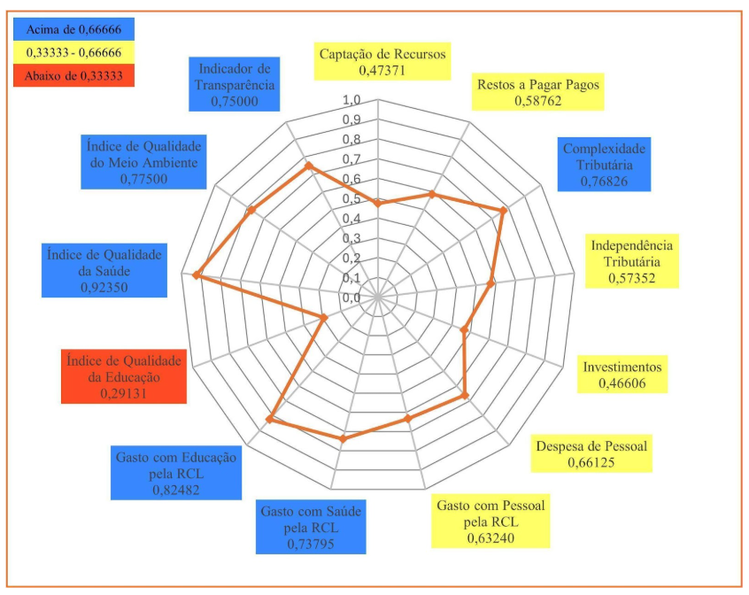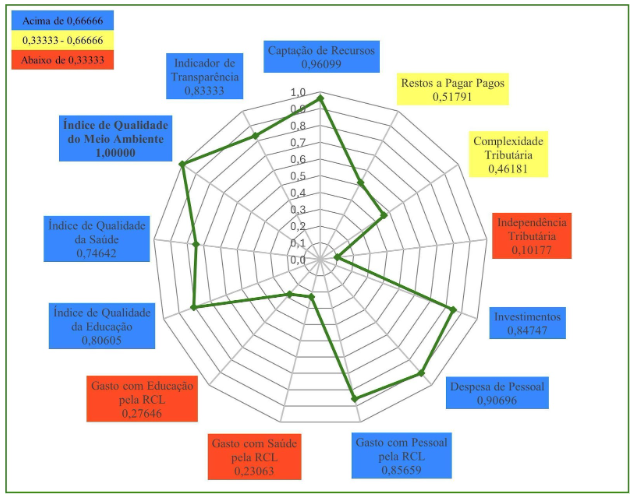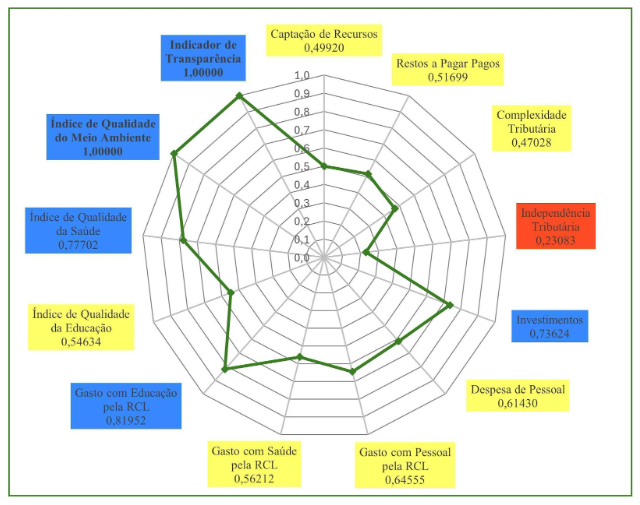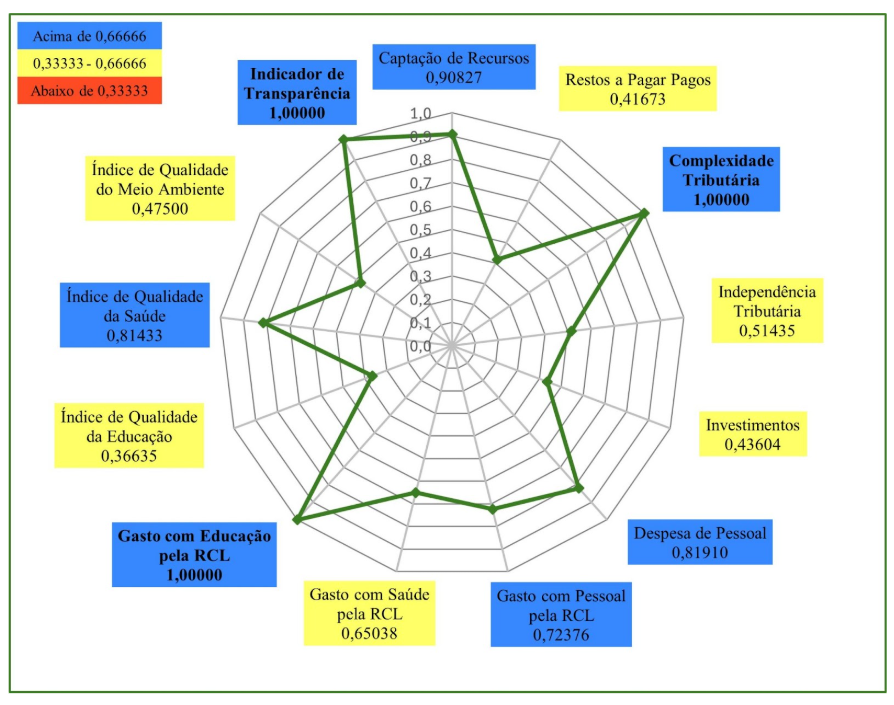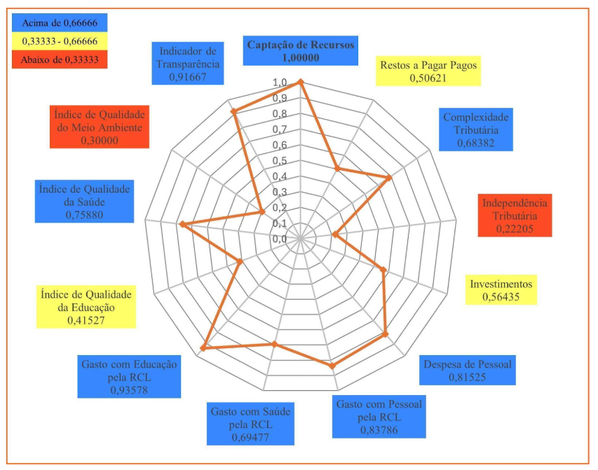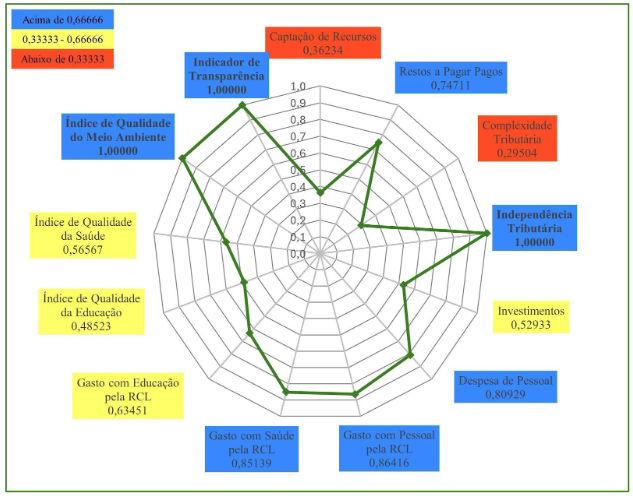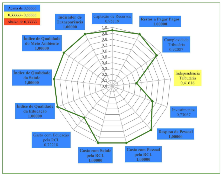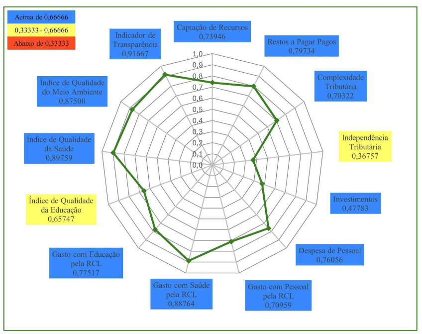 Em 2023, Caucaia (Gráfico 3) obteve nota máxima em três indicadores: Indicador de Transparência; Gasto com Educação pela RCL; e Complexidade Tributária. Em quatro indicadores o município obteve resultados entre 0,66666 e 1,00000. São eles: Captação de Recursos; Despesa de Pessoal; Índice Municipal de Qualidade da Saúde; Gasto com Pessoal pela RCL. Em seis indicadores o município obteve resultados entre 0,33333 e 0,66666: Gasto com Saúde pela RCL; Independência Tributária; Índice Municipal de Qualidade do Meio Ambiente; Investimentos; Restos a Pagar Pagos; e Índice Municipal de Qualidade Educacional. O município de Caucaia, também, não apresentou qualquer indicador abaixo de 0,33333, o que lhe permitiu a terceira posição no Ranking do ICGM 2023, dentre os municípios do Grupo Populacional 1.
