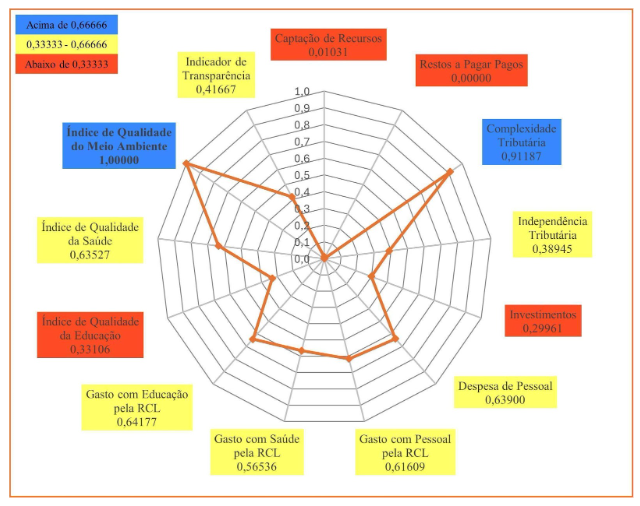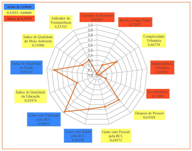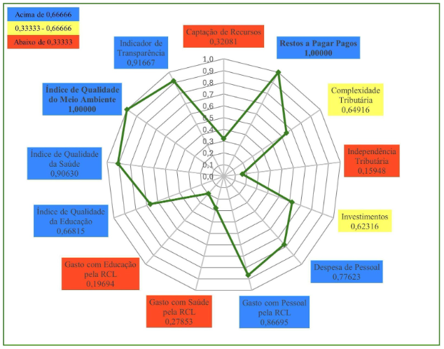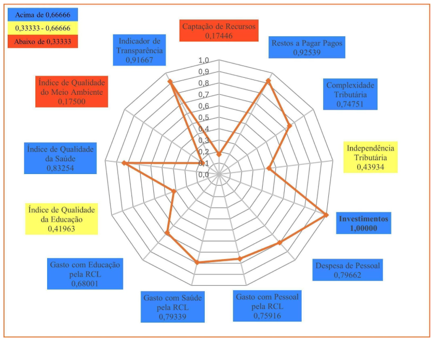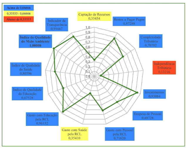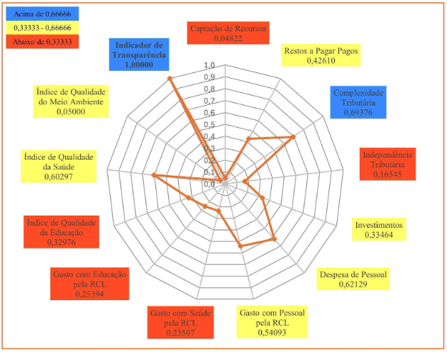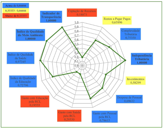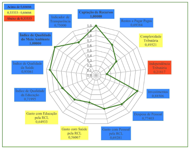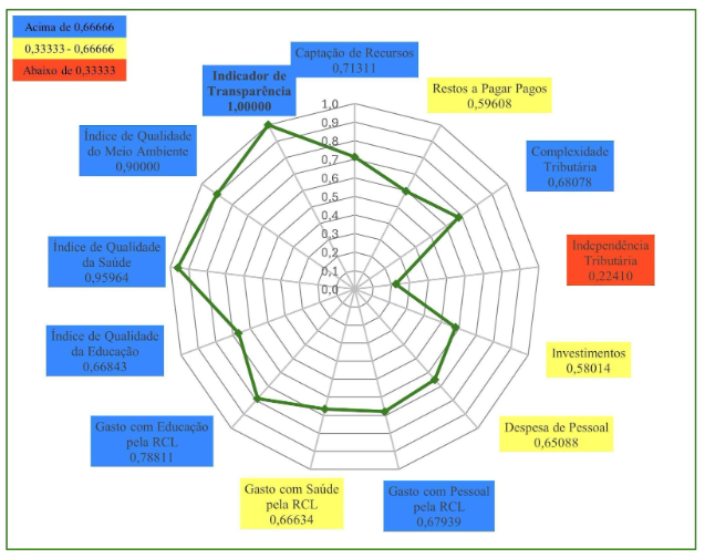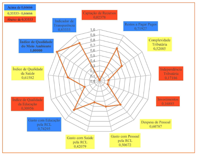 Em 2023, Caucaia (Gráfico 3) obteve nota máxima em três indicadores: Indicador de Transparência; Gasto com Educação pela RCL; e Complexidade Tributária. Em quatro indicadores o município obteve resultados entre 0,66666 e 1,00000. São eles: Captação de Recursos; Despesa de Pessoal; Índice Municipal de Qualidade da Saúde; Gasto com Pessoal pela RCL. Em seis indicadores o município obteve resultados entre 0,33333 e 0,66666: Gasto com Saúde pela RCL; Independência Tributária; Índice Municipal de Qualidade do Meio Ambiente; Investimentos; Restos a Pagar Pagos; e Índice Municipal de Qualidade Educacional. O município de Caucaia, também, não apresentou qualquer indicador abaixo de 0,33333, o que lhe permitiu a terceira posição no Ranking do ICGM 2023, dentre os municípios do Grupo Populacional 1.