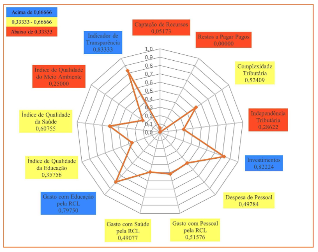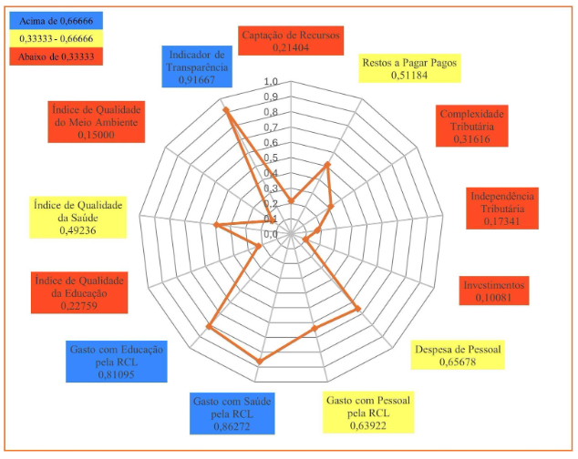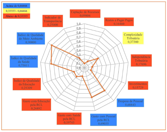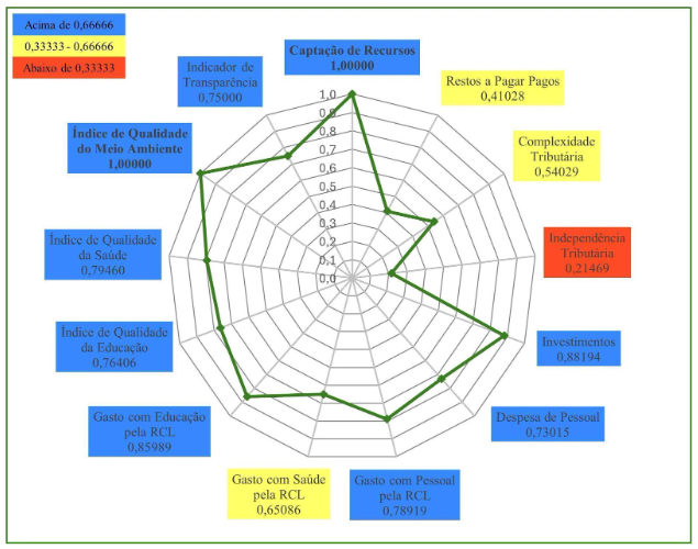 Por meio do Gráfico 4, observa-se que Juazeiro do Norte não alcançou resultado máximo (1,00000) nos seus indicadores, porém, em seis dos treze municípios, ele obteve valores acima de 0,66666.São eles: Índice Municipal de Qualidade da Saúde; Gasto com Educação pela RCL; Índice Municipal de Qualidade do Meio Ambiente; Complexidade Tributária; Indicador de Transparência; e Gasto com Saúde pela RCL. Em outros seis indicadores, o município obteve resultado entre 0,33333 e 0,66666. São eles: Despesa de Pessoal; Gasto com Pessoal pela RCL; Restos a Pagar Pagos; Independência Tributária; Captação de Recursos; e Investimentos. Somente no indicador Índice Municipal de Qualidade Educacional, o município de Juazeiro do Norte obteve resultado abaixo de 0,33333, colocando-o em último lugar entre os municípios do Grupo Populacional 1.