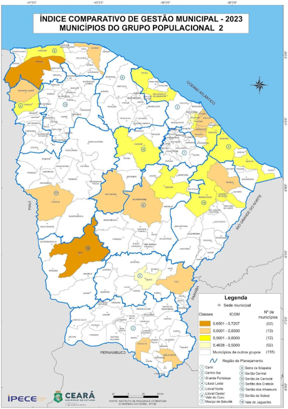 O Mapa 2 apresenta a distribuição geográfica do ICGM 2023 em relação aos municípios do Grupo Populacional 2, podendo-se comparar regionalmente o ICGM 2023 dos municípios, assim como localizar territorialmente os municípios com maiores e menores valores. Averigua-se através do referido mapa que cinquenta e oito municípios detiveram um Índice Comparativo de Gestão Pública superior a 0,500, estando eles distribuídos principalmente nas regiões: Cariri; Grande Fortaleza; Litoral Norte; Maciço de Baturité; Serra da Ibiapaba; e Sertões de Crateús.