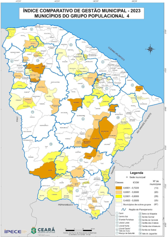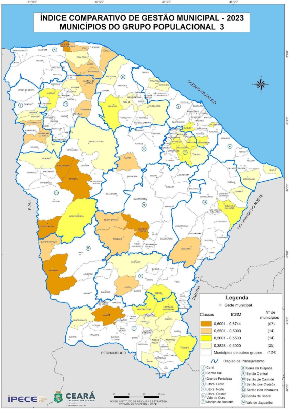 Na Tabela 8 verifica-se que Jijoca de Jericoacoara apresentou o maior ICGM 2023 (0,674) dentro do grupo dos municípios do Grupo Populacional 3, seguido por Novo Oriente (0,657) e Senador Pompeu (0,643). Dentre os dez municípios de maior ICGM 2023, três estão localizados nas Região de Planejamento Sertões de Crateús; dois nas regiões Litoral Norte; e apenas um município nas regiões Cariri; Sertão Central; Sertões de Canindé; Sertões de Inhamuns; e Vale do Jaguaribe.