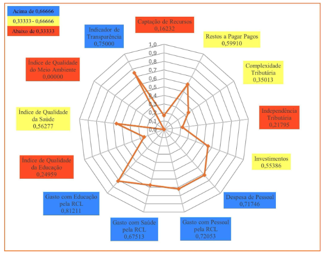 O município de Iguatu obteve a penúltima posição no Grupo Populacional 2. Como demonstra o Gráfico 11, o indicador Índice Municipal de Qualidade do Meio Ambiente alcançou valor máximo (1,00000). Somente o indicador Complexidade Tributária ficou com valor entre 0,66666 e 1,00000. Sete indicadores contribuíram para uma não qualidade na gestão municipal e obtiveram valores entre 0,33333 e 0,66666: Gasto com Educação pela RCL; Despesa de Pessoal; Índice Municipal de Qualidade da Saúde; Gasto com Pessoal pela RCL; Gasto com Saúde pela RCL; Indicador de Transparência; e Independência Tributária, enquanto os indicadores: Índice Municipal de Qualidade Educacional; Investimentos; Captação de Recursos; e Restos a Pagar Pagos tiveram os menores valores, sendo todos abaixo de 0,33333.