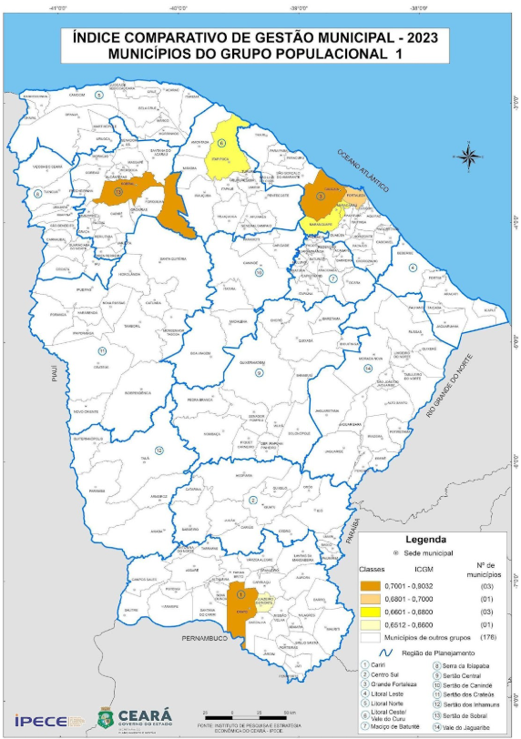 Na sequência, verifica-se, na Tabela 5, que Tauá apresentou o maior ICGM 2023 (0,721) nesse grupo dos municípios do Grupo Populacional 2, seguido por Granja (0,700) e Acaraú (0,648). Dentre os dez municípios de maior ICGM 2023, do Grupo Populacional 2, três estão localizados na Região de Planejamento Grande Fortaleza, dois pertencem à Região Litoral Norte e apenas um município nas regiões de Planejamento: Sertões de Inhamuns; Sertões de Canindé; Sertão Central; Sertões de Crateús; e Vale do Jaguaribe, mostrando uma certa dispersão espacial dos mais bem colocados.