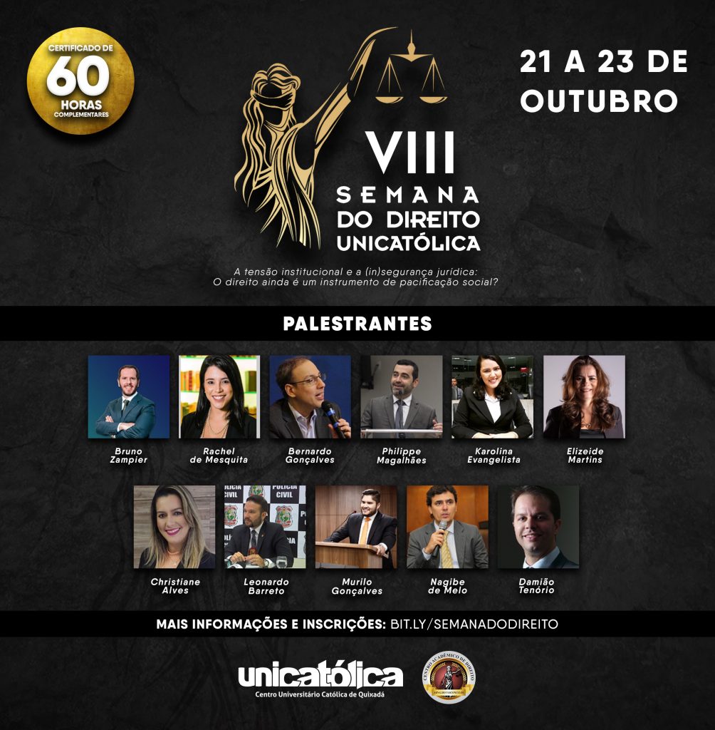 A VIII Semana do Direito ocorrerá de 21 a 23 de outubro, no Centro Acadêmico de Direito da Unicatólica de Quixadá (CE), um dos principais eventos da universidade chegando a movimentar os acadêmicos de Quixadá e cidades vizinhas.