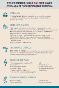 A resolução também isenta a incidência de coparticipação e franquia em mais de 250 procedimentos, como exames preventivos e de pré-natal e tratamentos de doenças crônicas, incluindo tratamento contra o câncer e hemodiálise. Além disso, fica proibido o uso de coparticipação e franquia diferenciada por doença ou patologia.