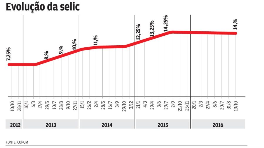 Após quatro anos sem uma baixa na taxa básica de juros (Selic), o Comitê de Política Monetária do Banco Central (Copom) anunciou a redução de 0,25 ponto percentual. A taxa de juros estava em 14,25% ano ano (a.a.), no primeiro corte desde outubro de 2012, por decisão unânime, o comitê decidiu baixar a taxa para 14% a.a., sem viés. O tímido recuo, que já era esperado, agradou a maioria dos agentes do mercado financeiro e entidades de classe.
