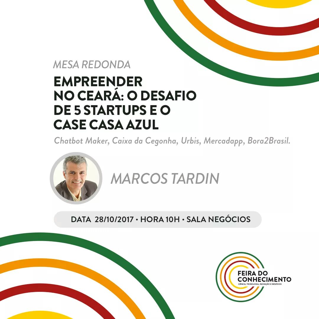 Marcos Tardin, diretor geral da Fundação Demócrito Rocha (FDR) e representante do Grupo de Comunicação O POVO na aceleradorade startups Casa Azul Ventures, vai mediar o debateEmpreender no Ceará - O desafio de 5 startups e o case Casa Azul. A mesa redonda faz parte da programação da Feira do Conhecimento e ocorre neste sábado, 28, às 10 horas, na sala de negócios do Centro de Eventos do Ceará.