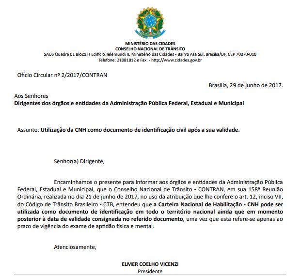 A Carteira Nacional de Habilitação (CNH) vencida pode ser usada, a partir de agora, como documento oficial de identificação. A resolução é do Conselho Nacional de Trânsito (Contran) e começou a valer na data de sua publicação no último dia 29.