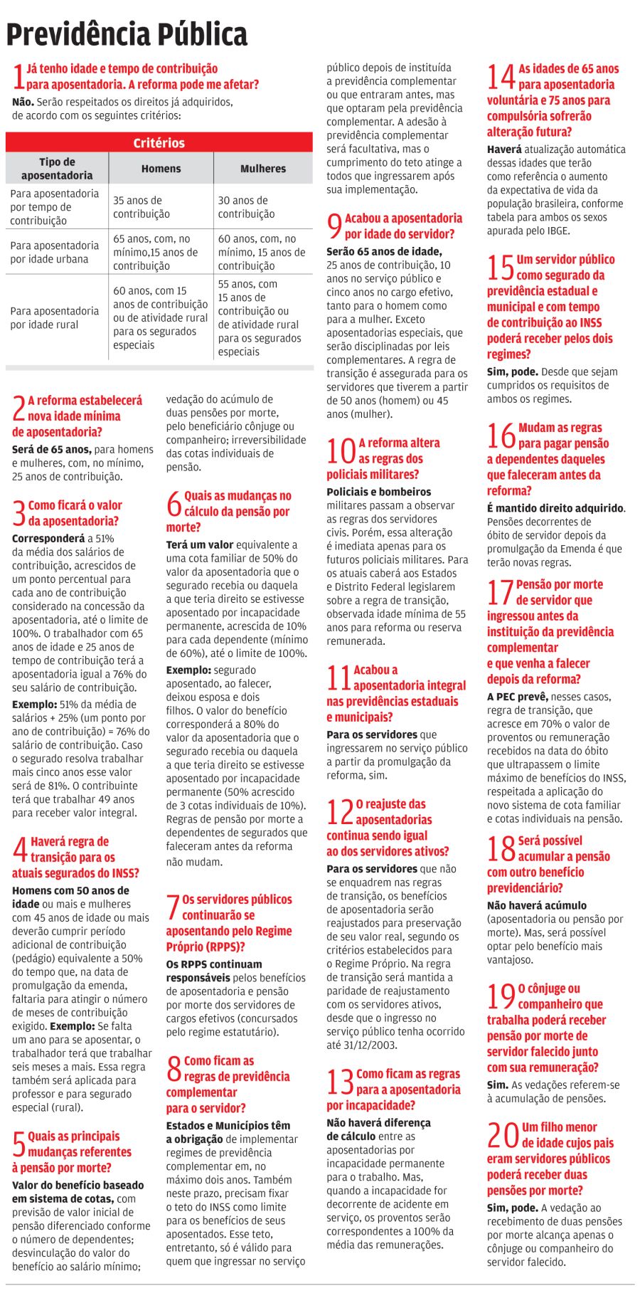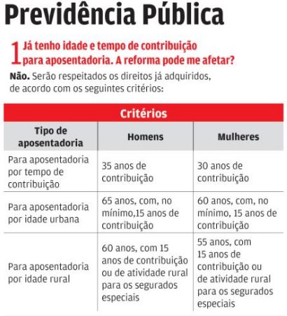 As regras da reforma têm que ser aprovadas pelo Congresso Nacional e valerão para homens com idade inferior a 50 anos e mulheres com menos de 45 anos, nunca sendo inferiores ao salário mínimo. Contribuintes acima dessa idade passarão por regra de transição. O chamado pedágio será o tempo de contribuição a mais que o contribuinte terá que trabalhar para obedecer às normas. Este tempo será de 50% a mais do que faltava para completar a aposentadoria. Se falta um ano, o contribuinte contribuirá por mais seis meses.