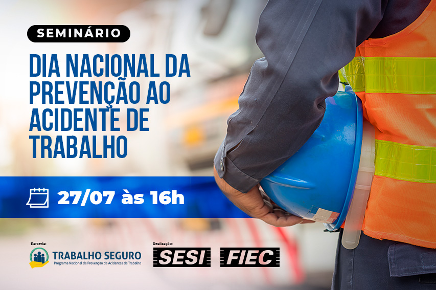 Em alusão ao dia da Prevenção de Acidentes de Trabalho (27 de julho), a Federação das Indústrias do Estado do Ceará (Fiec) realiza, por meio do Sesi Ceará, o Seminário - Dia Nacional de Prevenção de Acidentes de Trabalho. O evento visa promover debates, reflexões e terá apresentação de iniciativas e soluções para a indústria.