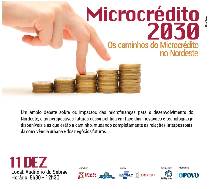 Fortaleza sedia o Fórum Microcrédito 2030, no dia 11 de dezembro, das 8h30min às 12 horas, no auditório do Sebrae Ceará. Realizado pela Fundação Demócrito Rocha (FDR), o mote principal do evento é debater sobre os caminhos do desenvolvimento do Nordeste. As inscrições são gratuitas e podem ser feitas por meio do link