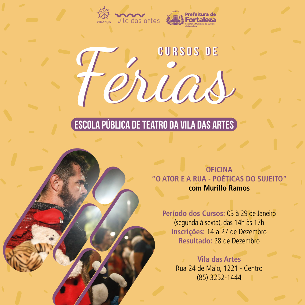 As inscrições para a oficina "O Ator e a Rua – Poéticas do Sujeito”, com Murillo Ramos, a ser realizada em janeiro de 2018, estão abertas até o próximo dia 27.A Vila das Artes é um equipamento da Prefeitura de Fortaleza e todas as suas atividades são gratuitas.