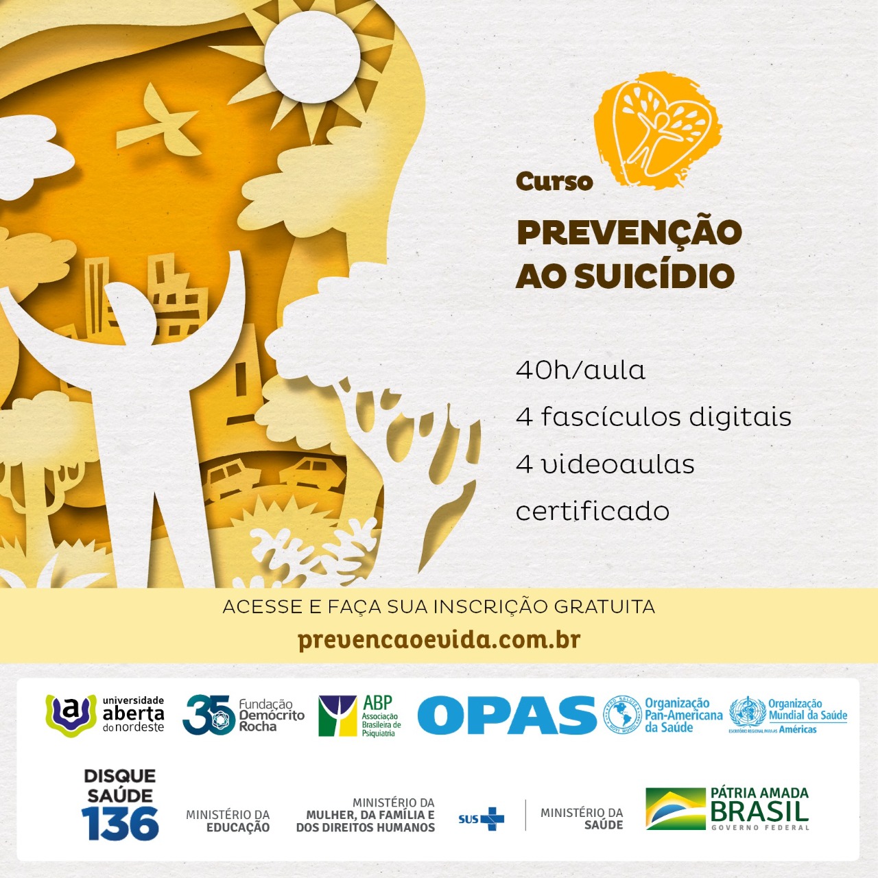 Para ter acesso às cartilhas digitais e se inscrever nos cursos de prevenção ao suicídio e da automutilação, acessehttp://prevencaoevida.com.br/#apresentacao.