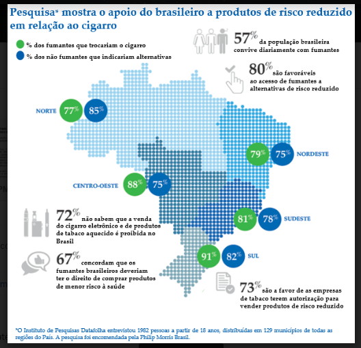 “É indiscutível que a maioria dos fumantes tem plena consciência dos danos causados pelo hábito de fumar cigarros. Contudo, muitos ainda continuarão fumando e sabem que sofrerão sérias consequências à sua saúde. A pergunta que se faz é, existindo soluções que tem o potencial de reduzir os danos à saúde, por que elas não estão hoje disponíveis aos adultos fumantes brasileiros? ”, argumenta Fernando Vieira, Diretor de Assuntos Corporativos da Philip Morris Brasil, empresa responsável pela contratação da pesquisa feita pelo Datafolha. Existem hoje milhões de pessoas que já trocaram o cigarro por produtos de risco reduzido em países como Japão, Alemanha, Itália, Suíça, Reino Unido, dentre muitos outros.