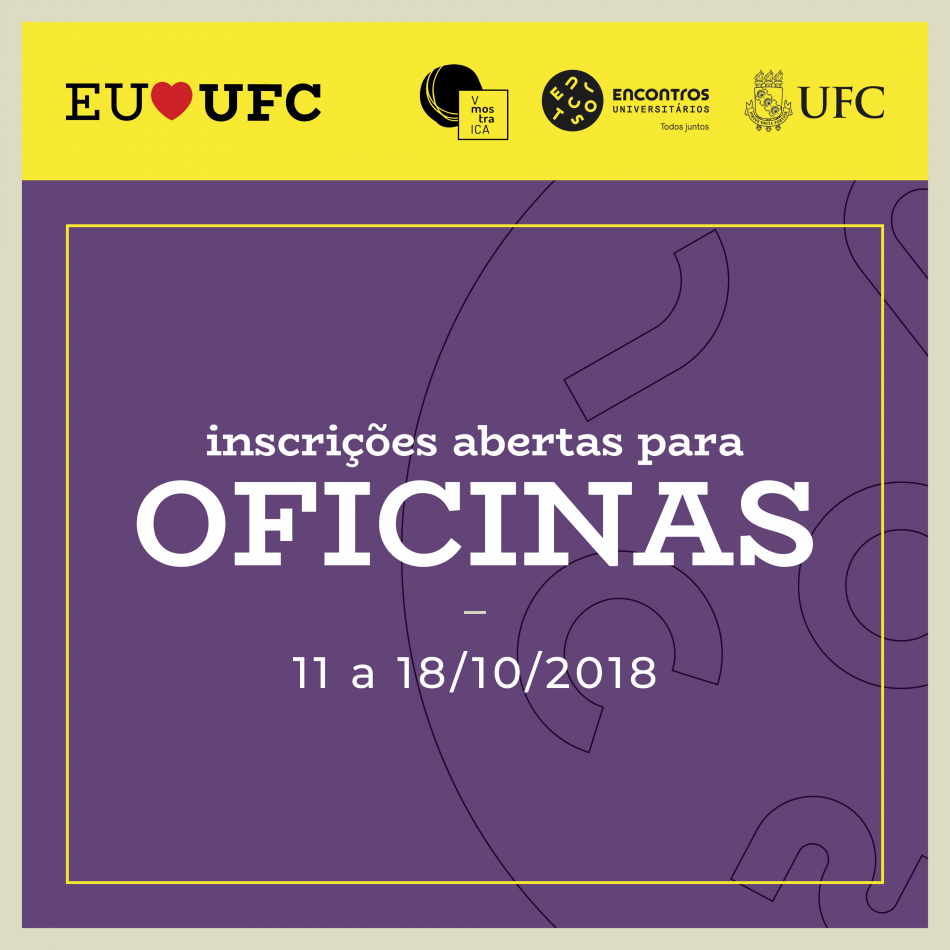 Até o próximo dia 18 de outubro estão abertas as inscrições para 25 oficinas e duas rodas de conversa da V Mostra ICA e do V Encontro de Cultura Artística da Universidade Federal do Ceará. Os eventos serão de 24 a 26 de outubro na sede do Instituto de Cultura e Arte (ICA), no Campus do Pici Prof. Prisco Bezerra, e em outros espaços da Universidade Federal do Ceará (UFC), durante a programação dos Encontros Universitários 2018 em Fortaleza.