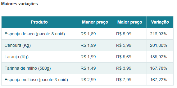 Entre os 61 itens, 10 produtos apresentaram variações acima de cem por cento. O quilo da cenoura, por exemplo, variou de R$ 1,99 a R$ 5,99, uma diferença de 201%. A laranja também está entre as maiores diferenças de preços, sendo encontrada de R$ 1,99 a R$ 5,69, ou seja, 185,92% de variação.